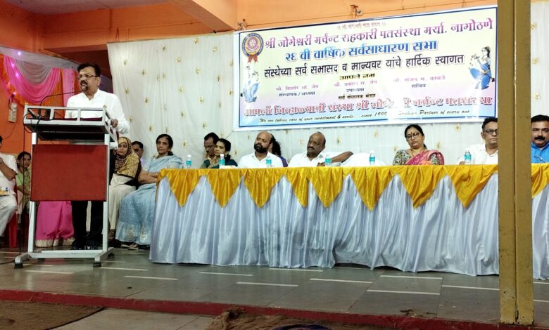 नागोठण्यातील नावाजलेल्या श्री जोगेश्वरी मर्चंट सहकारी पतसंस्थेची २६ वी वार्षिक सर्वसाधारण सभा येथील शिवगणेश सभागृहात रविवारी (दि. ७) सायंकाळी उत्साहात संपन्न झाली त्यावेळी किशोरशेठ जैन बोलत होते. यावेळी किशोरशेठ जैन यांच्यासह उपाध्यक्ष प्रकाश (घिसूशेठ) जैन, नागोठण्याच्या सरपंच सुप्रियाताई महाडिक, शिवसेना नागोठणे विभाग प्रमुख संजय भोसले, दैनिक सामनाचे उपसंपादक राजेश पोवळे, पतसंस्थेचे सचिव संजय काकडे, संचालक डॉ. मिलिंद धात्रक, रितेश दोशी, राजकुमार जैन, मोहन नागोठणेकर, विजया परमार, कल्पना टेमकर, दीपिका गायकवाड, नागोठणे ग्रामपंचायतीच्या सदस्या शबाना मुल्ला, व्यवस्थापक सुनील नावले आदींसह अनेक मान्यवर व सभासद यावेळी बहुसंख्येने उपस्थित होते.